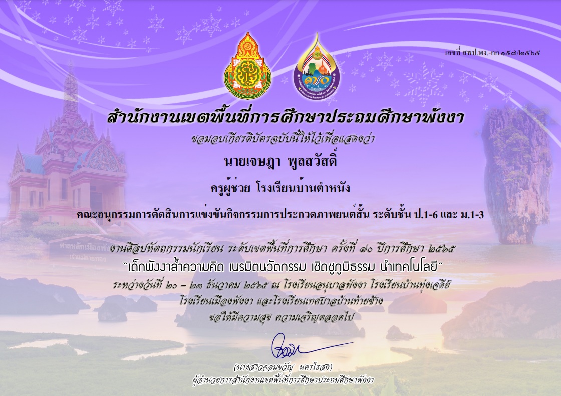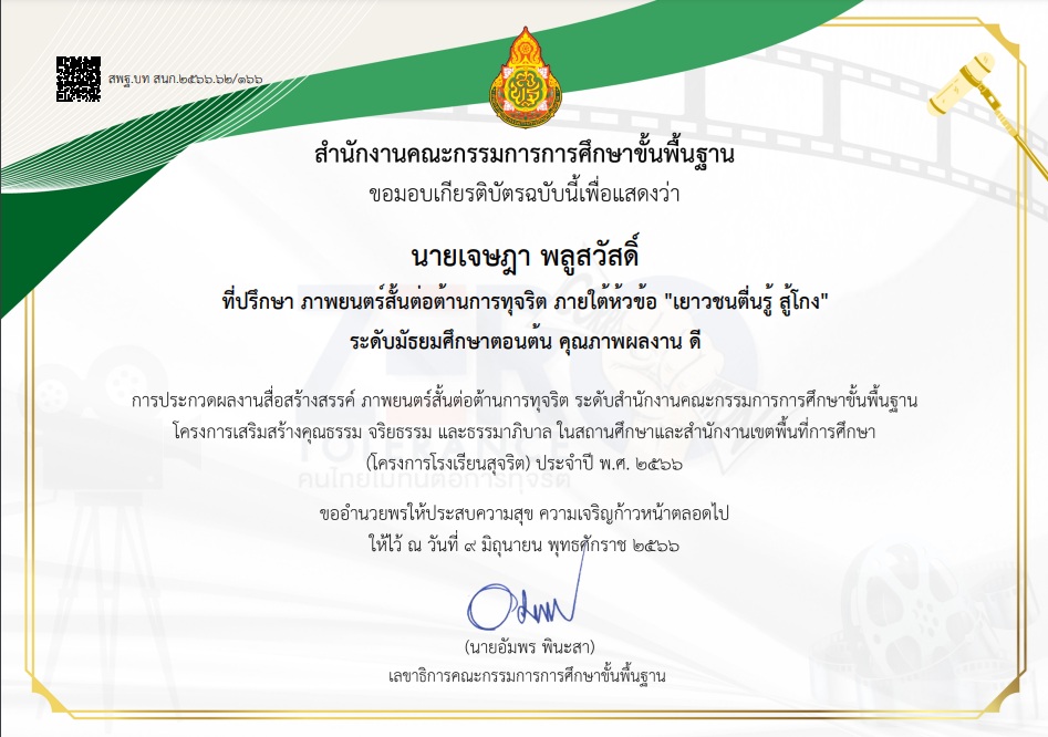 ที่ปรึกษา ภาพยนตร์สั้นต่อต้านทุจริต ภายใต้หัวข้อ "เยาวชนตื่นรู้สู้โกง" ระดับมัธยมตอนต้น คุณภาพผลงาน ดี ประจำปีการศึกษา 2566